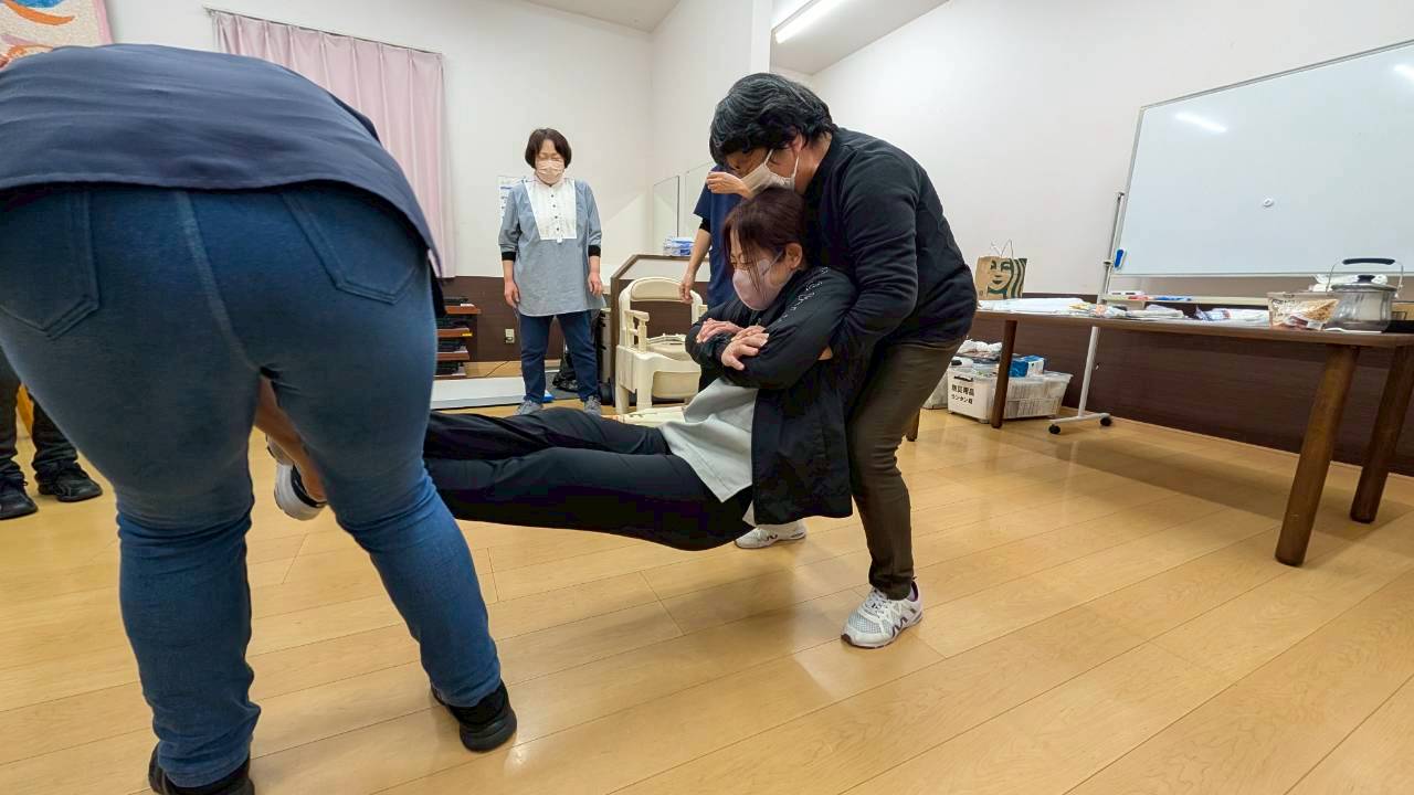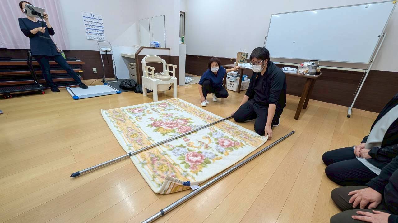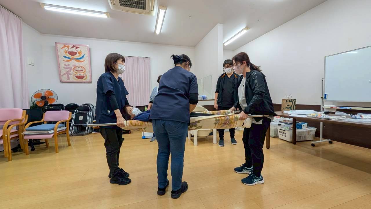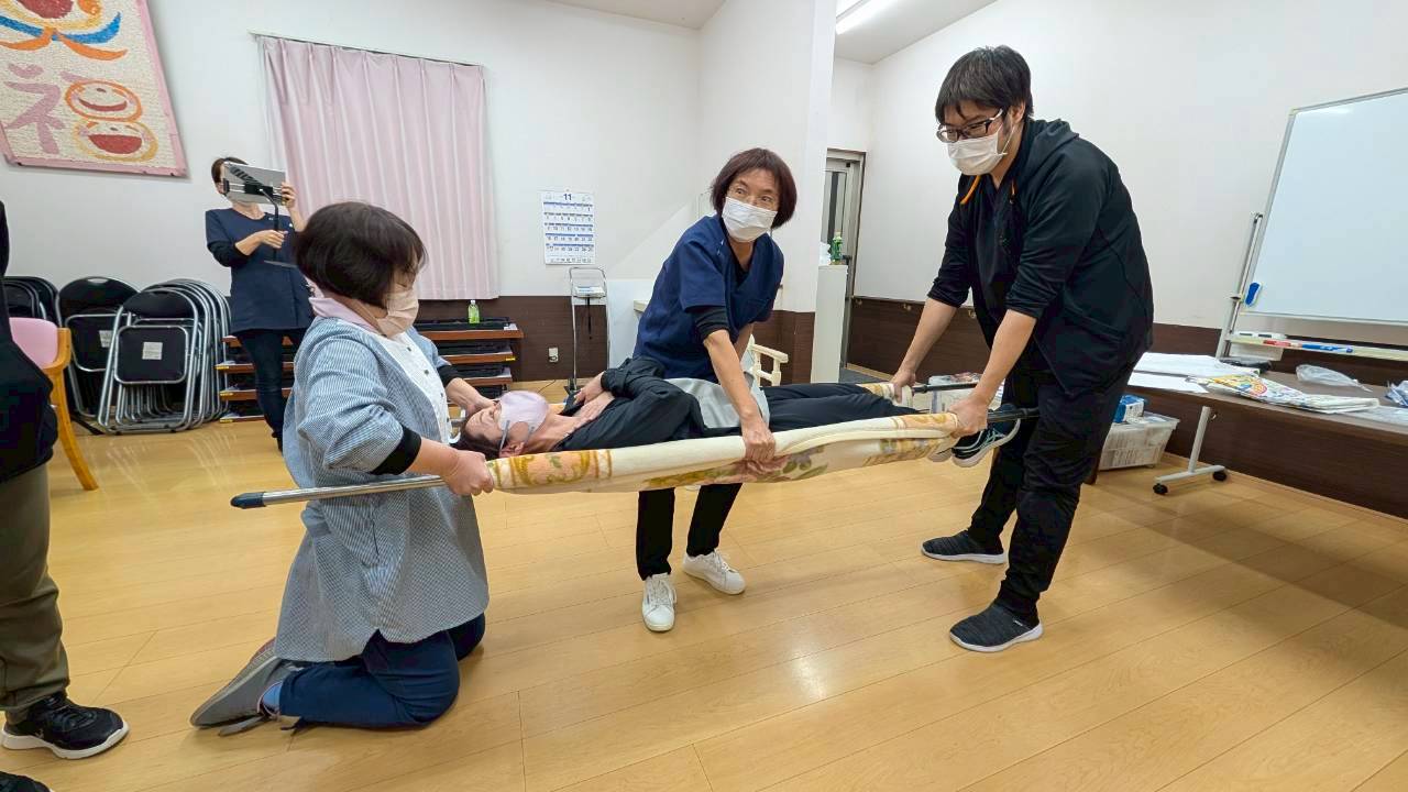 災害発生時の搬送方法を毛布と物干し竿を使用したり、その他の搬送方法を学び実践しました。